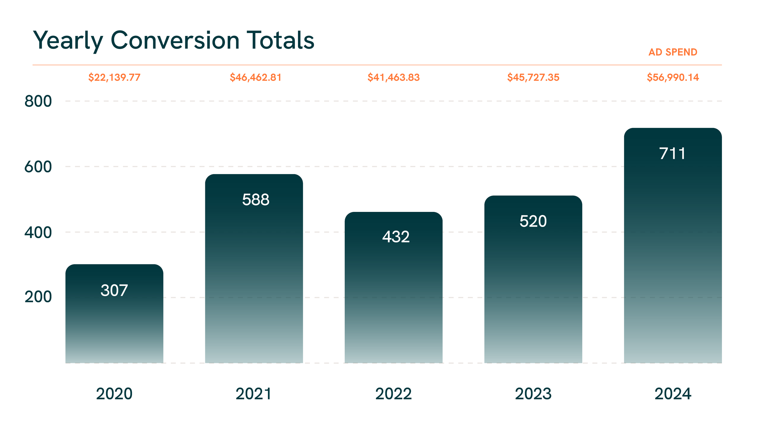 Overall, the Paid Search Campaigns have generated 2,848 conversions at a 21.92% Conv. Rate for an $83.71 Cost/Conv. From 2022 to 2024, the Google Ads campaigns have gone from generating 432 Leads (21.90% Conv. Rate & $95.98 Cost/Conv.) to 711 Leads (21.84% Conv. Rate | $80.21 Cost/Conv.). Over these years the average conversions per month has steadily increased from 36/Month in 2022 to 59/Month in 2024.